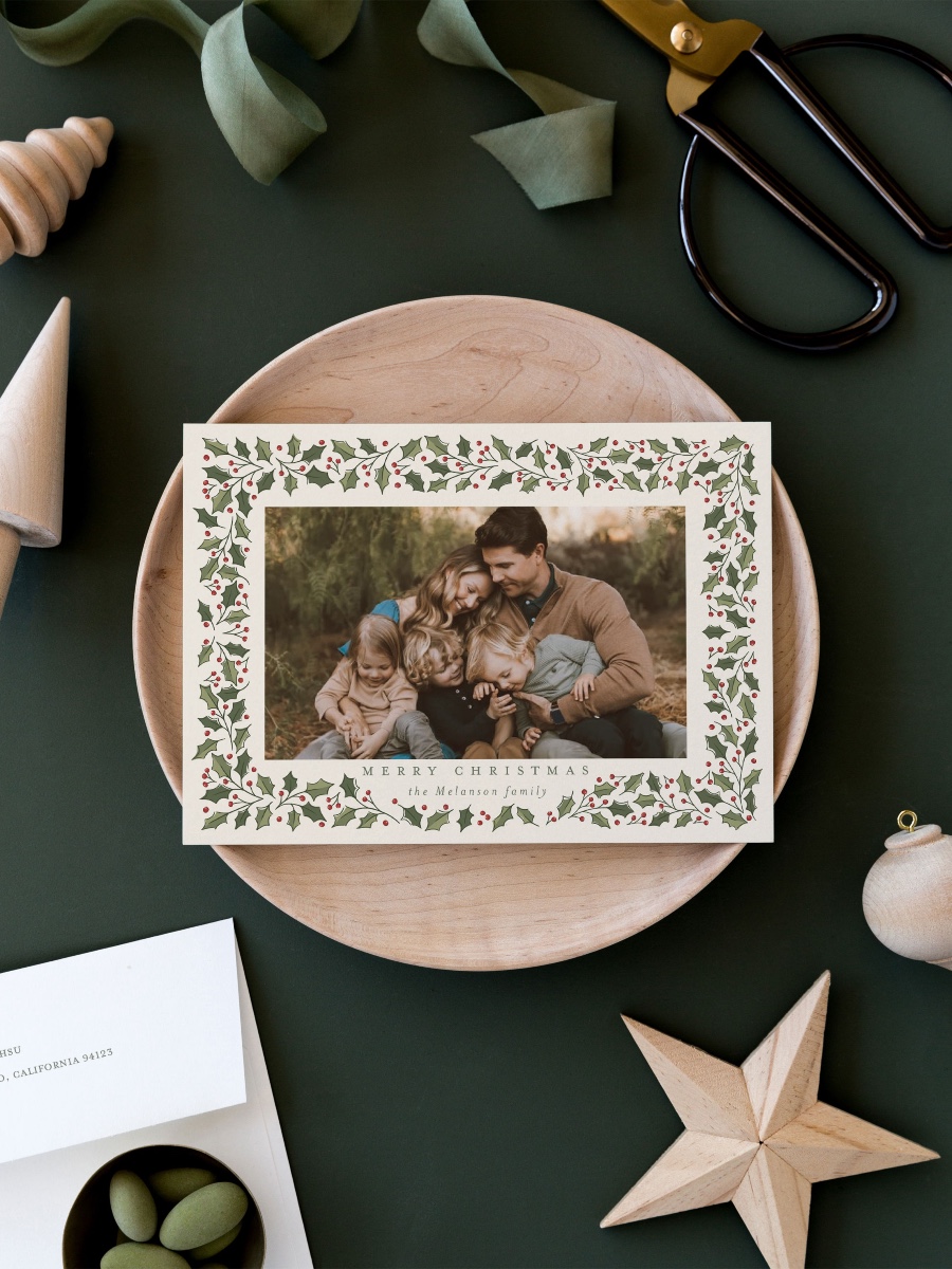 My collection with Minted holds a special place in my heart this year. One design in particular—Winter Garland—started as a design that wasn’t selected last year. But I believed in it, so it became the first holiday card I redesigned this year. The inspiration goes back to my childhood, when my mom would send packages wrapped in brown paper with hand-drawn holly leaves in the corners. At the time, I was completely amazed by her drawing skills. This design is an homage to those memories and the simple, heartfelt touches that make the holidays special.