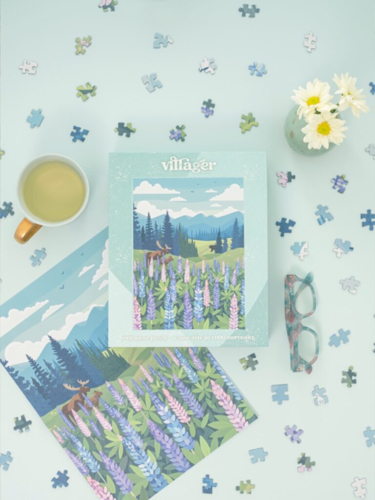 As an illustrator and surface designer, I’m constantly seeking new ways to bring my love for Canadian landscapes to life through meaningful product collaborations. Today, I’m thrilled to share my latest milestone: my first puzzle licensing partnership with Villager Puzzles, featuring my illustration Lupines Meadow.