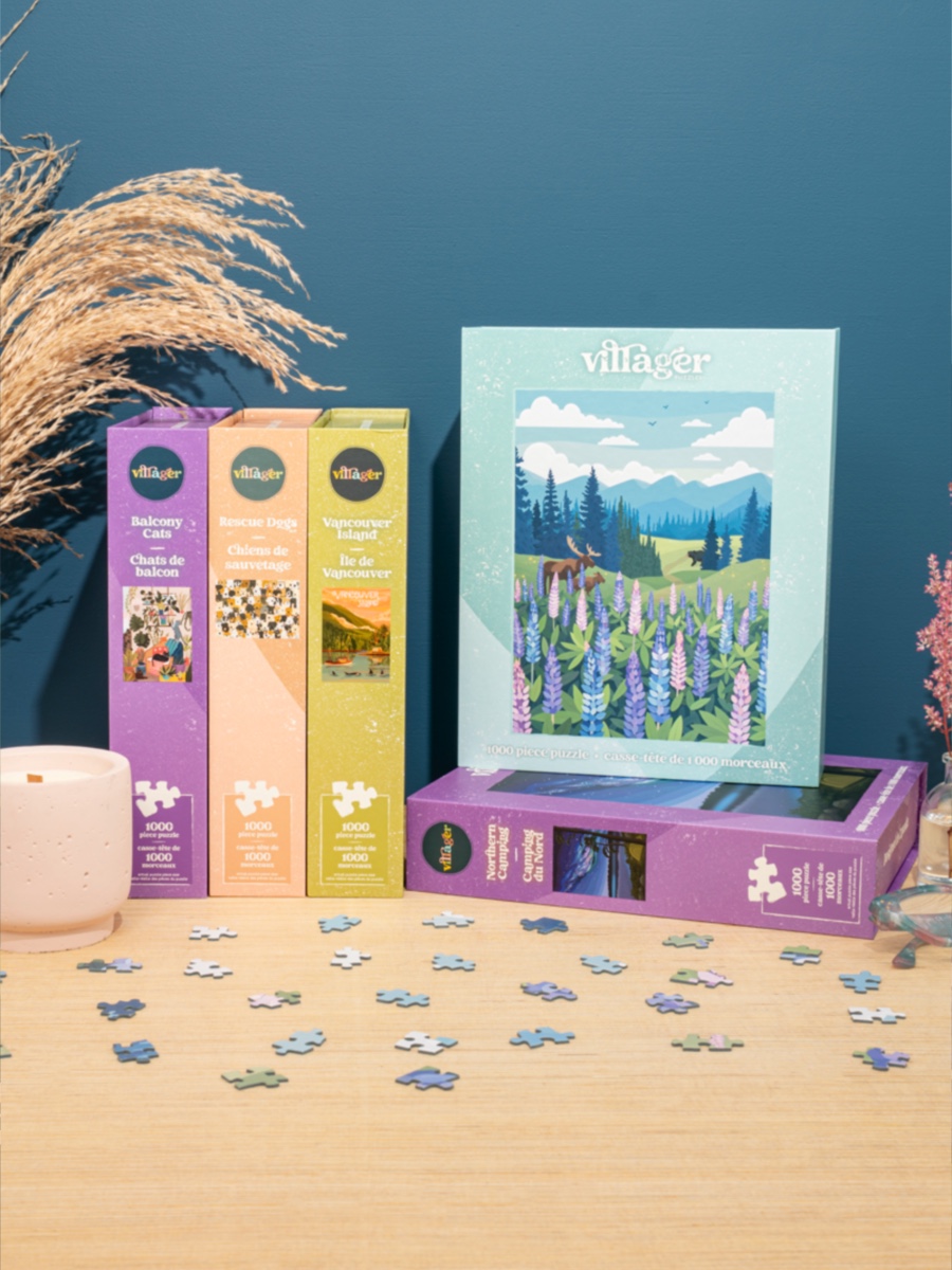 My partnership with Villager Puzzles began in fall 2024 when I submitted a design to their art call. While I didn’t win, placing in the top 10 was incredibly encouraging. The positive outreach and genuine support from their team moved me so deeply that it inspired me to create an entire series of Canadian landscape illustrations.
